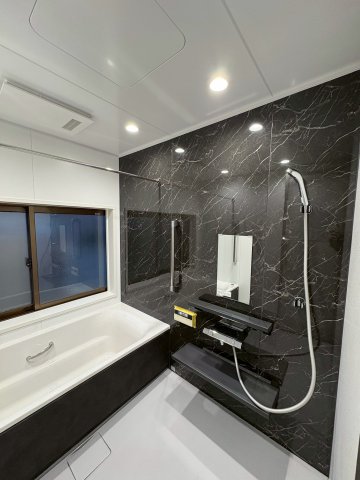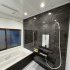 壁パネルはブラック系カラーを選択し、ホテルライクで落ち着きのある浴室空間に。 シンプルながらも上質感があり、長く飽きのこない仕上がりになっています。